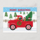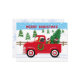 Drei Labradors Red Truck Weihnachtspostkarte für Labrador Besitzer. Das festliche Bild von Black Labrador, der seinen Vintagen Red Truck auf dem Weg zum Zuhause mit Weihnachtsbaum auf dem LKW-Bett fährt. Er hat auch Freunde auf dem LKW, sie sind Schokolade Labrador und Fox Red Labrador. Niedliche Labrador Cartoon Art erstellt von Naomi Ochiai.