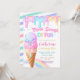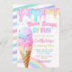 Featuring glitter-style watercolor ice cream scoops, dripping pastel rainbow colors, and playful confetti sprinkles, this invitation brings sweet party magic to life.