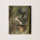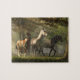 Three mustangs stand in a misty forest of the American West. The trio, a pinto, a roan and a white horse seem to be searching the woods for something. It's early in the day and rays the morning sun shine down through the tree canopy. The ground around the animals' hooves is a carpet of green undergrowth.