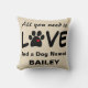 Niedliches Throwkissen mit der Hundetatze mit Herzen in ihm und im Sprichwort, aller, den Sie benötigen, ist Liebe und ein Hund, der Bailey genannt wird. Sie können es mit dem Namen Ihr eigener Hundes besonders anfertigen, da der Name ein Schablonengegenstand ist. Rückseite des Kissens hat das gleiche Sprichwort ist gegenüber von Farbkombination. Groß für Sie oder für einen Hundeliebhaber, den Sie kennen.