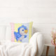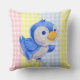 Kissen mit niedlichem blauen Vogel auf mehrfarbigem Gingham Hintergrund.