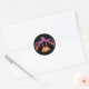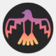 Schwarzer Aufkleber mit stilisiertem Donvogel in orangen, roten und lila Sonnenuntergangsfarben.