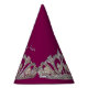 This party hat is shown in a plum wine-fuchsia color background and a silver and pearl tiara print all the way around. Text in coordinating color of silver-gray states Happy New Year.