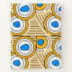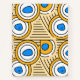 Moderne grafische Kunstwerke im erdigen Hintergrund mit farbenfrohen abstrakten Mustern in blau und gelb mit schwarzen Linien.