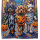 Adorable tibetische Spaniels, die in verspielten Halloweenkostümen gekleidet sind, tragen Kürbiseimer, während sie unter dem mondbeleuchteten Himmel tricksen oder behandeln. Dieses festliche Design hebt den seidigen Mantel der Rasse, die ausdrucksvollen Augen und die fröhliche Persönlichkeit hervor, die perfekt die gespenstische und doch lustige Atmosphäre Halloween-Abends einfangen lässt. Eine köstliche Feier für tibetische Spanielfreunde, Hundefreunde und Halloween-Fans gleichermaßen.