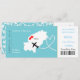 Eine lustige, aber stilvolle Hochzeitseinladung in einem Boarding-Pass/Ticket-Stil für Paare, die im Ausland heiraten, in Ibiza, die in einer weißen Karte Silhouette auf aquamarinem Blau mit süßen Herzen der Liebe, Flugzeug-Silhouette und weißen Perlen in Herzform dargestellt wird. Die Rückseite des Boarding-Passes hat ein hübsches elegantes Lackmuster.