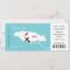 Eine lustige, aber stilvolle Hochzeitseinladung in einem Boarding-Pass/Ticket-Stil für Paare, die im Ausland heiraten, in Jamaika, die in einer weißen Karte Silhouette auf aquamarinem Blau mit süß-roten Lieben-Herzen, Flugzeug-Silhouette und weiße Perlen, die in eine Herzform wirbeln, gezeigt wird. Die Rückseite des Boarding-Passes hat ein hübsches elegantes Lackmuster.