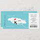 Eine lustige, aber stilvolle Hochzeitseinladung in einem Boarding-Pass/Ticket-Stil für Paare, die im Ausland heiraten, in Jamaika, die in einer weißen Karte Silhouette auf aquamarinem Blau mit süß-roten Lieben-Herzen, Flugzeug-Silhouette und weiße Perlen, die in eine Herzform wirbeln, gezeigt wird. Die Rückseite des Boarding Pass ist leicht mit Ihren Daten und persönlichem Foto anzupassen.