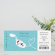 Eine lustige, aber stilvolle Hochzeitseinladung in einem Boarding-Pass/Ticket-Stil für Paare, die im Ausland heiraten. Das zeigt sich in einer Silhouette auf der Weißen Karte auf aquamarinem Blau mit süß-roten Lieben-Herzen, Silhouette im Flugzeug und weißen Perlen, die in Herzform wirbeln. Die Rückseite hat Platz für Ihr Foto und Ihre Kontakt-/UAWG-Daten