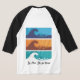 This clothing design centres around a powerful ocean theme. On the back of the shirt, a multi-panel graphic is featured: three horizontal sections each display a large stylized wave with smaller waves receding behind it. The top panel utilizes cool blue and dark blue hues, suggesting a tranquil sea or distant horizon. The middle panel shifts to warmer orange and brown tones, evoking a sunset or sunrise over the water. The bottom panel brings in a prominent white crashing wave against a teal background, adding a dynamic touch. Below these panels, the phrase "Life Flows Like An Ocean" is written in a graceful script font, lending a contemplative and philosophical dimension to the design. The front of the shirt then carries two distinct, active wave illustrations. One depicts a large, dynamic wave with frothy details, rendered in a teal line art style, giving it a vibrant, hand-drawn look. Below this, the phrase "Ride The Waves" is presented in a similar script font, serving as an encouraging and adventurous call to action. The other front design is a smaller, more detailed line art illustration of a breaking wave. This combination on the front creates a varied yet cohesive message of embracing challenges. The overall aesthetic perfectly blends a serene, reflective outlook on life's journey with an energetic, proactive spirit, all unified by the timeless and powerful imagery of ocean waves.