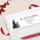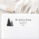 Das Label der Adresse des Pinienwaldes mit einer monochromen Schwarz-Grau-Abbildung auf der links und einem Familiennamen und einer Adresse in einem handgeschriebenen eleganten Schriftart rechts.