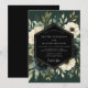 Ein anspruchsvolles Design mit einem reichen, tiefgrünen Hintergrund, geschmückt mit einer üppigen Anordnung cremefarbener und tiefblauer Blüten, ergänzt durch üppiges Laub. Diese opulente botanische Darstellung weckt ein Gefühl von dunkler Romantik und zeitloser Eleganz, perfekt für ein großes Ereignis. Die prominenten Blüten ähneln Anemonen und dunklen Rosen.