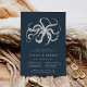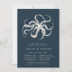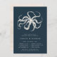 Unsere Küsten-Chic-Probe-Dinner-Einladungen verfügen über eine Vintag geätzte Oktopus-Abbildung in cremiger weißer Farbe auf marineblau Hintergrund. Personalisieren Sie Ihre Hochzeitsfeier Probe und Dinner Feier Details unten.