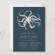 Unsere Küsten-Chic-Probe-Dinner-Einladungen verfügen über eine Vintag geätzte Oktopus-Abbildung in cremiger weißer Farbe auf marineblau Hintergrund. Personalisieren Sie Ihre Hochzeitsfeier Probe und Dinner Feier Details unten.