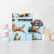 Tierarztmuster mit Hunden, Katzen, Frettchen, Kaninchen, Papageien, medizinischen Peelings und Stethoskopen.