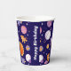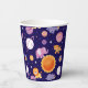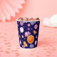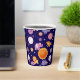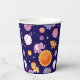 ein Muster mit Leerzeichen. Dieses Muster zeigt eine Vielzahl von Himmelsobjekten und Tieren. Es gibt Planeten verschiedener Größen und Farben, wie lila, orange und gelb, zusammen mit einer hellen Sonne. Außerdem gibt es hier auch Tiere, darunter einen rosa Elefanten, einen gelben Löwen und einen lila Nilpferd, der inmitten der Himmelskörper schwebt. Der Hintergrund ist ein tiefschwarzes Bild, das die hellen Farben der Planeten und Tiere unterstreicht.