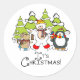 Ein niedlicher, farbenfroher Weihnachtsgestalteraufkleber mit Eisbär, Pinguin und Maus mit Schals und eisbedeckten Skaten mit schneebedeckten Bäumen und Text, der lautet Weihnachten!