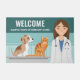 Desteis originelle niedliche Cartoon-Abbildung einer Tierärztin, die in einem Untersuchungsraum einer Tierklinik stehend ist. Der Tierarzt trägt einen weißen Labormantel, blaue Skulpturen und hat ein Stethoskop um den Hals. Der Tierarzt hat braunes Haar und einen lächelnden Gesichtsausdruck. Vor dem Tierarzt sitzen eine orangefarbene Katze und ein brauner und weißer Welpe auf einem grauen Untersuchungstisch. Es gibt auch zwei personalisierbare Textbereiche.