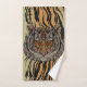 Das ist ein aufwändiges, dekoriertes Gesicht eines Tigers auf einer Tigerhautkulisse für Kontrast. Fett und wild mit tierischem Magnetismus. Ideal für ein Badezimmer mit Tigermotiven. Bezaubernd und exotisch.