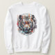 Das Bild ist ein digitales Kunstwerk, das als zentrales Thema das Gesicht eines stilisierten Tigers zeigt. Das Gesicht des Tigers ist in lebhaften Farben dargestellt, darunter Orange-, Weiß-, Schwarz- und Blau- und Rosa-Tönen, die einen dynamischen und heftigen Ausdruck verleihen.
