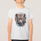 Das Bild ist ein digitales Kunstwerk, das als zentrales Thema das Gesicht eines stilisierten Tigers zeigt. Das Gesicht des Tigers ist in lebhaften Farben dargestellt, darunter Orange-, Weiß-, Schwarz- und Blau- und Rosa-Tönen, die einen dynamischen und heftigen Ausdruck verleihen.
