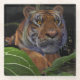 Ein orangefarbener Tiger kröpft zwischen grünen Dschungel-Pflanze und stalkt seine Beute vorsichtig an.