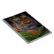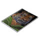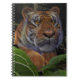 Ein orangefarbener Tiger kröpft zwischen grünen Dschungel-Pflanze und stalkt seine Beute vorsichtig an.