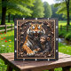 This dramatic square wall clock features a highly dimensional, close-up illustration of a large, fierce tiger roaring and a small, smiling monkey nestled right next to it. The entire design is rendered in vibrant orange, black, and brown tones, strongly suggesting a deep carved relief or Engraved Wood Look against a dark wood plank background. The tiger's face and paws are prominently displayed, and the monkey has a cheerful expression. They are framed by a prominent, gnarled tree root structure and dark maple-like leaves carved into the perimeter. The carving style gives the entire image a strong three-dimensional, sculpted quality. The large, three-dimensional embossed text "BESTIES FOR LIFE" is omitted from this specific design. The clock face features a simple clock face border with large, white, numbered tick marks (1 to 12) integrated into the outer frame. The artwork is surrounded by a thick, dark brown decorative border that resembles a black wood frame.