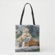 Ein bezaubernder Tigerkub, der ihrer Mutter ein Bad auf dieser wunderschönen Totentasche gibt.