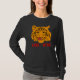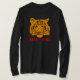 Zeichn eines Tigers oder einer Tigerfigur in Schwarz-Orange-Farben. Der Tiger oder Tiger leckt seine Lippen. Text Kiss - Kiss. T - Shirt der Frau. Text Kiss auf der Rückseite. Sie können sowohl den Text als auch das Bild ändern oder löschen. Dunkle und schwarze Farbprodukte.