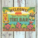 Tiki Bar theme willkommen matt mit Tiki Gesichtern, Sonnenuntergang am Strand, Palmen, tropische Pflanze, und Bambuszaun. Fügen Sie Ihren Namen zu anpassen. Vergnügen Sie sich in einem tropisch kitschigen Stil für Ihre Bar, Tiki Lounge oder Luau.