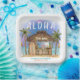 Tiki Party Geburtstagspapier-Teller verfügen über ein Aquarelltiki-Bar am Strand nachts unter dem Mond und Sterne mit Palmen, Lichtern, Tiki Fackeln und einem hawaiianischen "Aloha"-Gruß. Tropische Cocktails, Ananas, Blätter aus Hibiskus und Palmen, Surfbrett und Papagei in einem Piraten, der den Bar schmückt. Kunst von KL Stock