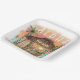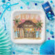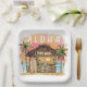 Tiki Themenquadrat Teller verfügen über ein Aquarell Tiki Bar am Strand bei Sonnenuntergang mit Palmen, Lichter, Tiki Fackeln und "Aloha" Gruß. Tropische Cocktails, Ananas, Blätter aus Hibiskus und Palmen, Surfbrett und Papagei in einem Piraten, der den Bar schmückt. Ideal für Paare mit Dusche, Hochzeitsempfang, Verlobungsfeier und Jubiläumsfeiern. Kunst von KL Stock