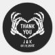 Schwarze Hochzeit danke Ihnen Aufkleber aus der Sammlung "'Til ath do us part". Es ist mit spukhaften Skeletthand ausgestattet, die ein Herz auf der Vorderseite bildet. Party liefert ein bearbeitbares Datum und die Initialen oder Namen von Braut und Bräutigam. Besuchen Sie unsere Kollektion, um mehr koordinierende Elemente zu sehen, die dieses Design für Ihre besondere Veranstaltung passen.