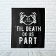 Hochzeitsfeier oder Empfang-Banner mit dem Zitat "Der Tode macht uns Teil", Skelettopfer bilden ein Herz. Schwarzer Hintergrund mit einem bearbeitbaren Datum und den Initialen von Braut und Bräutigam. Besuchen Sie unsere Kollektion, um mehr koordinierende Elemente zu sehen, die dieses Design für Ihre besondere Veranstaltung passen.