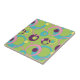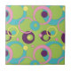 Der hellgrüne Hintergrund ist mit einem trendigen Muster von Kreisen, Punkten und Ringen in verschiedenen lebhaften Farben, darunter Rosa, Blau, lila und Gelb, geschmückt. Diese Kachel kann gerahmt werden, um ein Trivet zu erstellen oder in einem Holzdeckel Geschenkboxen platziert werden. Auch Fliesen ohne Rahmen passen in die große Geschenkboxen, um ein passendes Set zu erstellen.