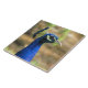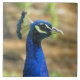 Pfauenkopfportrait. Brillante blaue Federn an Hals und Kopf, mit weißen Markierungen um die schwarzen Augen. Hintergrund ist diffuse Pflanze Leben. Die "corona" oder "Wappen" Federn am Hinterkopf bilden eine blaue "Krone" auf feinen weißen Stielen.