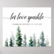 Dieses rustikale, waldlandschaftliche Chic-Schild, das auf unsere Hochzeitskollektion von Timber Grove abgestimmt ist, lädt die Hochzeitsgäste zum Feiern des glücklichen Paares mit einem funklerischen Sendoff ein. Personalisieren Sie sich mit zwei Textzeilen in Kalligraphie-Skript und traditioneller Serifenschrift (zeigt mit "Gelassen Liebe Sparkle: funkler sendoff at [time]"). Ein tiefer Rand der Aquarellkiefern im Jägergrün rundet das Aussehen ab.