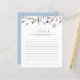Create a lasting memory for the couple with this beautiful Time Capsule Dusty Blue Wildflower Bridal Shower Advice Card! This stunning card features hand painted dusty blue wildflowers, coupled with elegant hand lettered calligraphy. Each card provides lines for guests’ advice that can be read during the couple’s first and tenth wedding anniversaries. It’s a thoughtful way to look back on your married life together, recalling the words of wisdom heard from loved ones on the day of your nuptials. Perfect for an extra special bridal shower favor or keepsake, this timeless dusty blue wildflower card will make the couple smile for years to come. Let the happy couple celebrate with style and class–you won’t want them to miss out on this meaningful bridal shower game! Coordinating sign sold separately. Contact designer for matching products. Copyright Anastasia Surridge for Elegant Invites, all rights reserved.