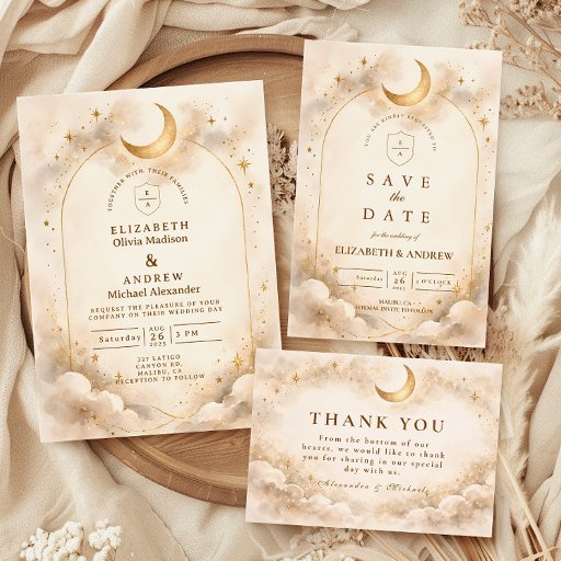 A refined celestial design featuring delicate crescent moons, scattered constellation stars, and a warm parchment-toned background. A thin gold border frames the layout, while elegant typography creates a timeless, sophisticated composition. The subtle vintage texture and balanced spacing give this piece a romantic, storybook feel without overwhelming the details. Perfect for couples who love classic elegance with a soft cosmic touch.