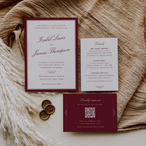 Adorned with a maroon and ivory color palette, it offers a rich and welcoming aesthetic. Colors can be customized to align with your wedding theme.