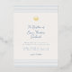 Timeless baptism invitation that combines soft blue stripes on light beige background, a delicate gold foil shell cross symbol, and handscript font. Elegant and modern.