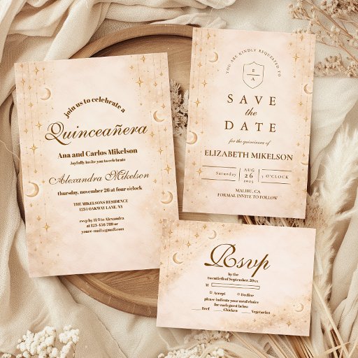 A luminous celestial design featuring delicate crescent moons and scattered constellation stars across a warm parchment background. A refined gold border frames the composition, while elegant script typography creates a graceful focal point worthy of such a meaningful milestone. The soft ivory and champagne tones give the entire piece a timeless, radiant glow. Perfect for a quinceañera celebration that feels romantic, elevated, and touched by starlight.