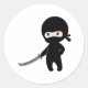 Niedlicher, aber wütender Cartoon Ninja in schwarz gekleidet hält ein traditionelles japanisches Katana Schwert.