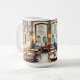 Perfektes Geschenk für den Reise- und Kaffeeliebhaber. Die Aquarellmalerei zeigt das gemütliche Interieur eines kleinen Kaffeehauses in Genf, Schweiz. Die rustikalen Holztische und -stühle sind eng angeordnet, was eine intime Atmosphäre schafft. An den cremefarbenen Wänden hängen gerahmte Kunstwerke und kleine Pflanze, die den Charme und die persönliche Touch ausstrahlen. An einem Tresen aus poliertem Holz befindet sich eine Vintage Espressomaschine, Gebäck-Gläser und schön gestapelte Tasse aus der Keramik. Durch große Fenster strömt sanftes natürliches Licht herein, das ein warmes Licht ausstrahlt und einen Blick auf die Gassen von Genf im Freien bietet. Gönnen Sie sich einen Kaffee beim Lesen oder unterhalten Sie sich in einem ruhigen Gespräch und sorgen für ein ruhiges und einladendes Ambiente. Das Gemälde vereint wunderbar die schlichte Eleganz und den einladenden Charme dieses Schweizer Cafés.