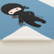 Niedlicher Cartoon Ninja in schwarz gekleidet hält einen Wurfstern. Traditionelles japanisches Schwert Katana kann man an seiner Schulter sehen.