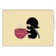 Eine hübsche kleine schwarze Ninja sitzt in der Nähe einer großen Tasse dampfenden Kaffee über den Beinen. Das japanische Katana-Schwert ist ihm über den Rücken gefesselt.