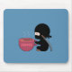 Eine hübsche kleine schwarze Ninja sitzt in der Nähe einer großen Tasse dampfenden Kaffee über den Beinen. Das japanische Katana-Schwert ist ihm über den Rücken gefesselt.