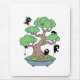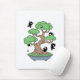 Einfache Abbildung eines japanischen Topfbonsai-Baumes in einem flachen Tablett. Eine Gruppe winziger Ninjas machte diesen Baum zu ihrer Basis. Mehrere Ninjas verstecken sich hinter dem Blätterdach. Eine ist von einem Seil an einen Ast gebunden, eine andere bewegt sich über dem Baum, der an einen Drachen befestigt ist.