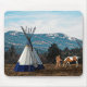 Ein Bild eines Indianers und seines Pferdes in der Nähe eines Tipis. Schnee hat sich auf den höheren Hängen der Berge im Hintergrund niedergelassen.
